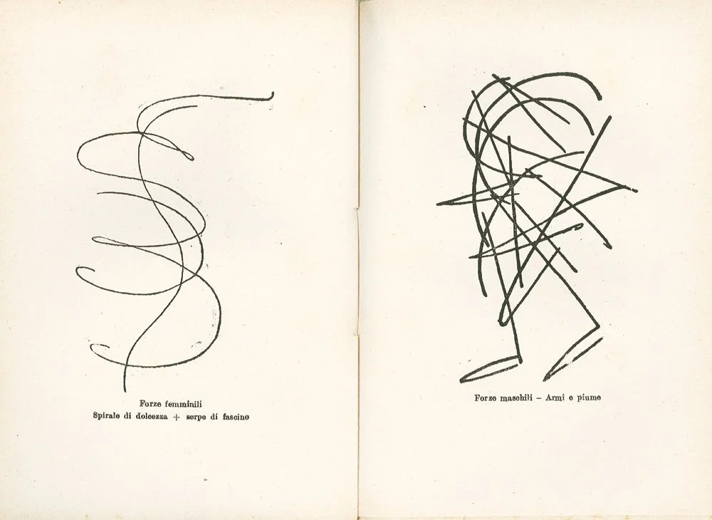 Benedetta’s illustration of “Forze femminile”, however, is slightly harder to interpret. It is subtitled “Spirale di dolcezza + serpe di fascino” which translates into “spiral of sweetness + serpentine fascination” (Larkin 456). There is a somewhat vertical line that a series of thin, fluid lines spiral around– the vertical line could be interpreted as the “spine” of a human figure, but otherwise this sketch is not as obviously a human-like figure as the “Forze maschili” figure is. Interestingly, Benedetta has ascribed two characteristics to the “Forze femminile”, whereas she has only ascribed one characteristic to the “Forze maschili”, perhaps a nod to the simultaneità that exists within women. In this case, “sweetness” and a “serpentine nature” – two seemingly contradictory traits– are attributed to women, and could be interpreted as a woman’s seemingly simple, sweet nature masking a more shrewd and discerning nature within. The general underestimation of women, which Benedetta seems to be commenting on here, could be how she viewed women who lived in a world dominated by the Futurists and their masculine values.